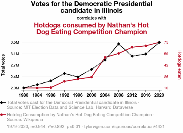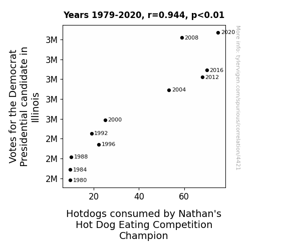 This means 89.2% of the change in the one variable (i.e., Hotdogs consumed by Nathan's Hot Dog Eating Competition Champion) is predictable based on the change in the other (i.e., Votes for the Democrat Presidential candidate in Illinois) over the 11 years from 1979 through 2020.