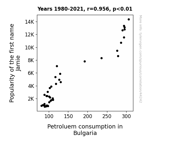 This means 91.5% of the change in the one variable (i.e., Petroluem consumption in Bulgaria) is predictable based on the change in the other (i.e., Popularity of the first name Jamie) over the 42 years from 1980 through 2021.
