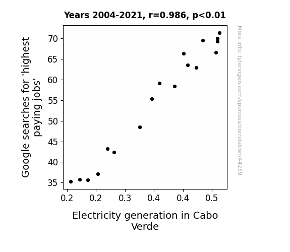 This means 97.2% of the change in the one variable (i.e., Electricity generation in Cabo Verde) is predictable based on the change in the other (i.e., Google searches for 'highest paying jobs') over the 18 years from 2004 through 2021.