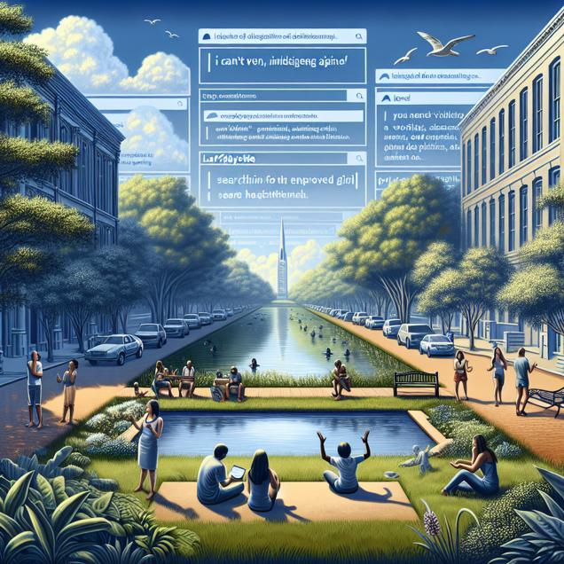 Prompt: [ Data cyber art ] Prompt: Generate an image that features a serene urban landscape set in Lafayette, Louisiana. The scene showcases a clear blue sky, gentle breeze, and lush greenery. People can be seen outdoors, expressing joy and relaxation in the improved air quality. Simultaneously, incorporate a subtle layer within the image where individuals are engaged in online activities, indicating their search for "i cant even" on Google. This juxtaposition should portray a sense of tranquility alongside the modern-day digital expressions of bewilderment and disbelief. The depiction should include only scenes, people, and objects, it should not include text or speech bubbles.