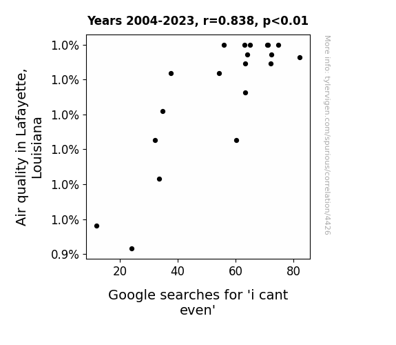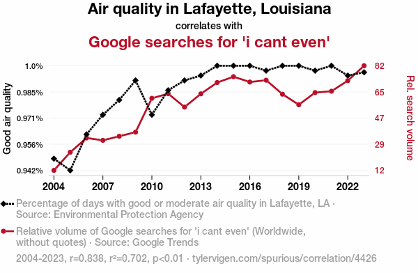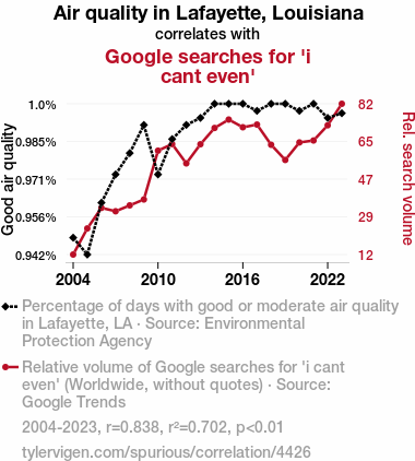 - The spurious research paper: Gasping for Fresh Air: An Analysis of Air Quality in Lafayette, Louisiana and the Correlation with Google Searches for 'I Can't Even'