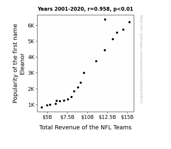 This means 91.9% of the change in the one variable (i.e., Total Revenue of the NFL Teams) is predictable based on the change in the other (i.e., Popularity of the first name Eleanor) over the 20 years from 2001 through 2020.