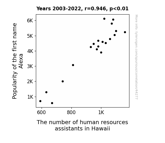 This means 89.5% of the change in the one variable (i.e., The number of human resources assistants in Hawaii) is predictable based on the change in the other (i.e., Popularity of the first name Alexa) over the 20 years from 2003 through 2022.