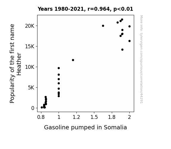This means 92.9% of the change in the one variable (i.e., Gasoline pumped in Somalia) is predictable based on the change in the other (i.e., Popularity of the first name Heather) over the 42 years from 1980 through 2021.