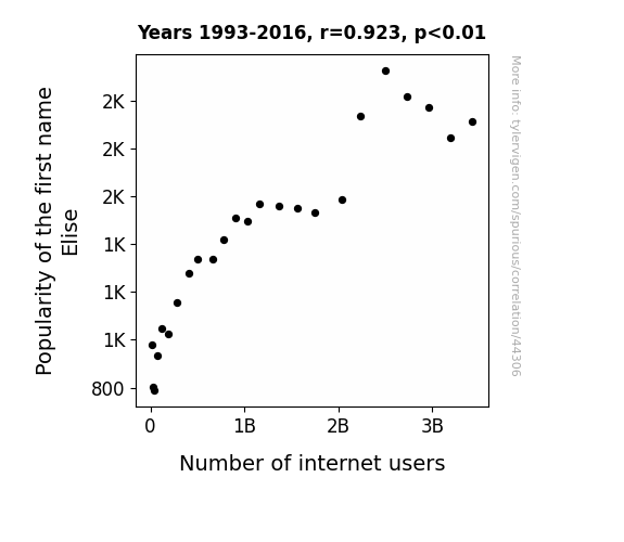 This means 85.1% of the change in the one variable (i.e., Number of internet users) is predictable based on the change in the other (i.e., Popularity of the first name Elise) over the 24 years from 1993 through 2016.