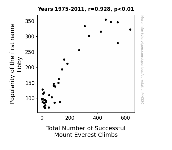 This means 86% of the change in the one variable (i.e., Total Number of Successful Mount Everest Climbs) is predictable based on the change in the other (i.e., Popularity of the first name Libby) over the 37 years from 1975 through 2011.