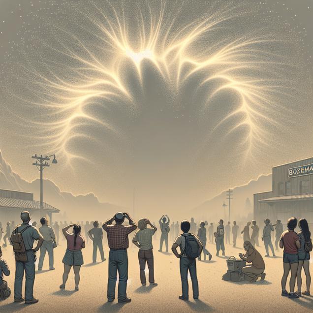 ChatGPT: Generate an image depicting a hazy sky above Bozeman, Montana, filled with charged particles forming a unique pattern resembling the iconic hairstyle of Donald Trump. People in the scene are looking up, puzzled, and searching on Google for 'who is donald trump,' intrigued by the political Rorschach test in the smoggy sky. The image should convey the unusual sight and the intrigue of the people, keeping the visual depiction simple yet impactful.