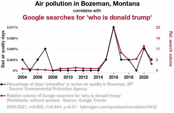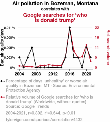 - The spurious research paper: Bozeman's Haze, Trump's Craze: The Surprising Link Between Air Pollution and Searching for Donald Trump