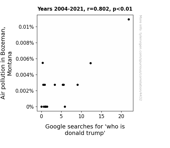 This means 64.4% of the change in the one variable (i.e., Google searches for 'who is donald trump') is predictable based on the change in the other (i.e., Air pollution in Bozeman, Montana) over the 18 years from 2004 through 2021.