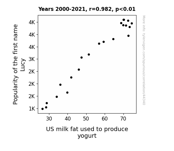 This means 96.4% of the change in the one variable (i.e., US milk fat used to produce yogurt) is predictable based on the change in the other (i.e., Popularity of the first name Lucy) over the 22 years from 2000 through 2021.