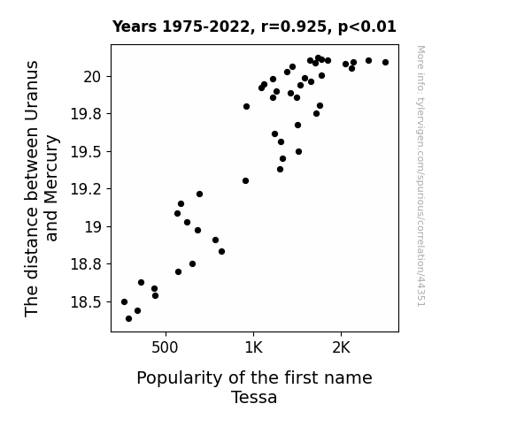 This means 85.6% of the change in the one variable (i.e., Popularity of the first name Tessa) is predictable based on the change in the other (i.e., The distance between Uranus and Mercury) over the 48 years from 1975 through 2022.