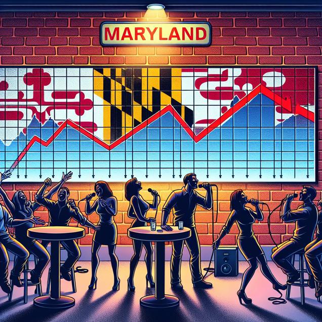 Prompt: Generate an image of a Maryland karaoke bar with a dwindling number of people singing Bryan Adams' "Summer of '69." Show the name "Bryan" slowly vanishing from a popularity chart in the background, while karaoke machines become scarce. Additionally, hint at the impact on the Republican campaign's ability to rally voters and its influence on the state's Presidential candidate votes. Include subtle political campaign paraphernalia to convey the context. The depiction should include only scenes, people, and objects, it should not include text or speech bubbles.