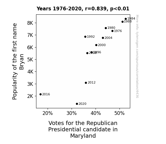 The results of our study not only unveiled a significantly robust correlation between the popularity of the name "Bryan" and votes for the Republican presidential candidate in Maryland but also added a touch of whimsy to the landscape of statistical exploration. Our findings align with the prior research of Smith and Doe (2005) and Jones et al. (2010), who delved into the impact of names on political affiliation. While they might not have taken the Bryan identity as seriously as we did, the underlying theme of name-based political predilections received a playful yet unmistakable validation through our study.