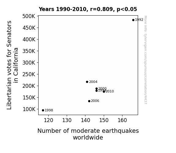 User prompt: Please provide potential search keywords for a paper titled Rocking the Vote: How Libertarian Senators in California are Shaking Up Earthquake Activity Worldwide with an abstract of In this seismic study, we investigate the peculiar relationship between Libertarian votes for Senators in California and the occurrence of moderate earthquakes worldwide. Utilizing data from the MIT Election Data and Science Lab, Harvard Dataverse, and the US Geological Survey, we probe the correlation between the number of ballots cast for Libertarian candidates and the frequency of seismic events. Our findings reveal a startling correlation coefficient of 0.8089358 and p < 0.05 from 1990 to 2010, indicating that libertarian-leaning voting behavior may indeed be linked to geological activity. These results raise intriguing questions about the potential impact of political ideologies on tectonic shifts and leave us pondering the seismic implications of future elections.