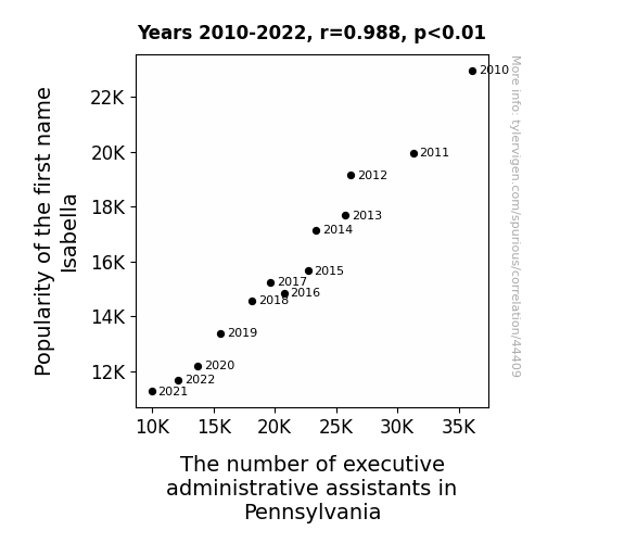 This means 97.7% of the change in the one variable (i.e., The number of executive administrative assistants in Pennsylvania) is predictable based on the change in the other (i.e., Popularity of the first name Isabella) over the 13 years from 2010 through 2022.