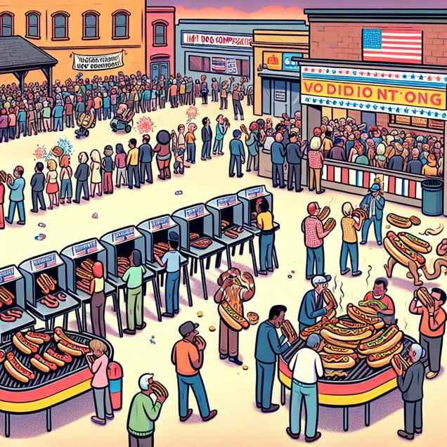 User prompt: Please describe a visual scene that prominently depicts both Votes for the Democrat Presidential candidate in New Mexico and Hotdogs consumed by Nathan's Hot Dog Eating Competition Champion, in the following situation: As the Democratic support sizzled in New Mexico, it created a real "frank-furter" frenzy. The surge in votes somehow sparked a wiener-takes-all mindset, leading to a bunless quest for victory. Maybe the competition just couldn't ketchup to the political excitement, or perhaps there's a link between ballot boxes and lunch boxes that we never knew existed!. Keep the description simple.