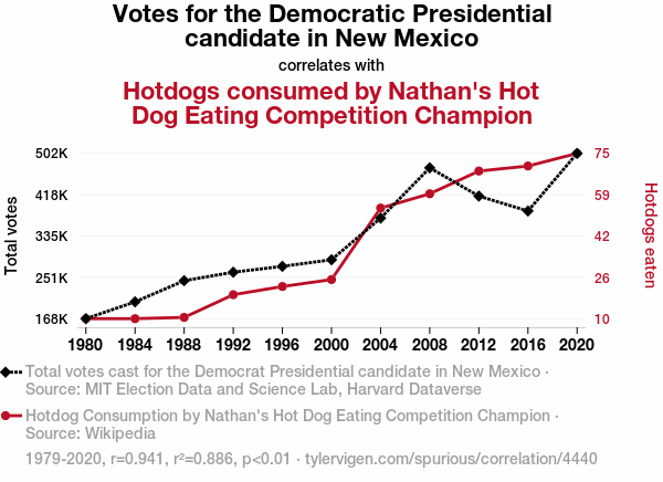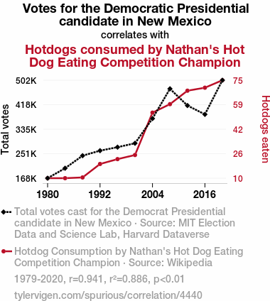 - The spurious research paper: Weiner Winner: Wacky Correlation between Dem Votes in New Mexico and Nathan's Hot Dog Consumption