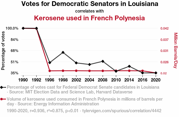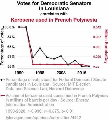 Upon delving into the data with all the fervor of a sleuth on a mission, we discovered a staggering correlation between Democrat votes for Senators in Louisiana and the consumption of kerosene in French Polynesia. It was as if the Bayou and the Pacific had decided to do the statistical tango, twirling and swirling their way into a remarkable relationship.
