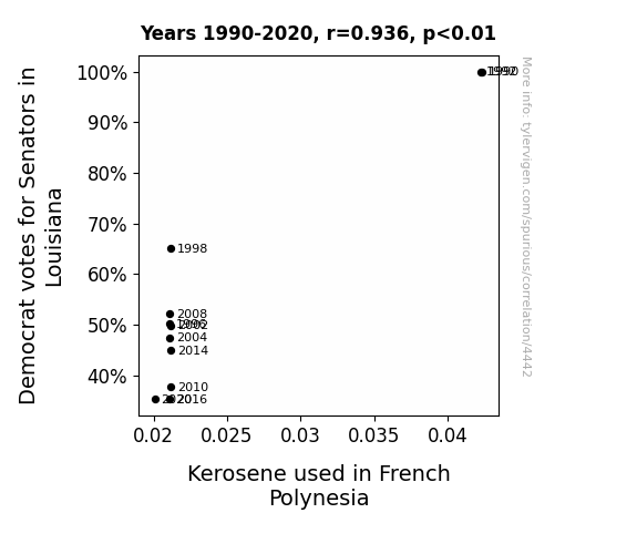This means 87.5% of the change in the one variable (i.e., Kerosene used in French Polynesia) is predictable based on the change in the other (i.e., Votes for Democratic Senators in Louisiana) over the 11 years from 1990 through 2020.