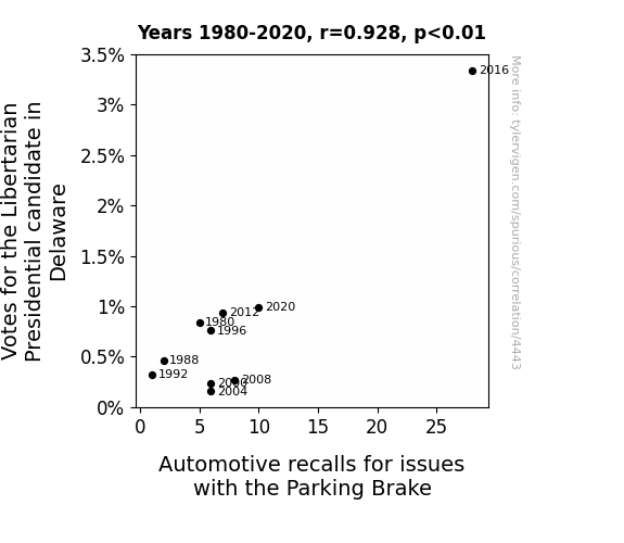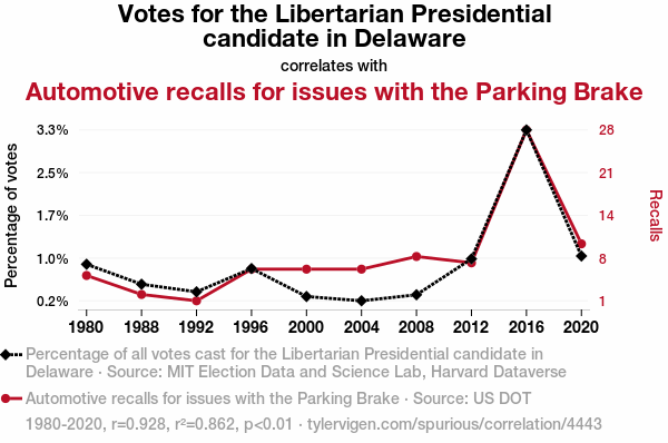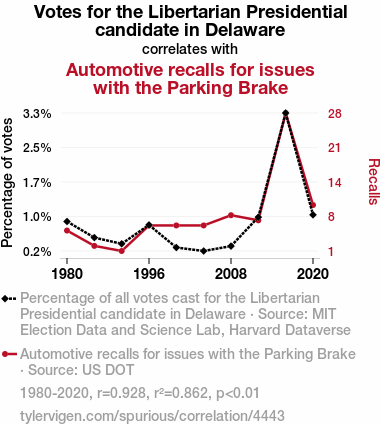 - The spurious research paper: Brake-ing the Pattern: The Correlation Between Votes for the Libertarian Presidential Candidate in Delaware and Automotive Recalls for Issues with the Parking Brake