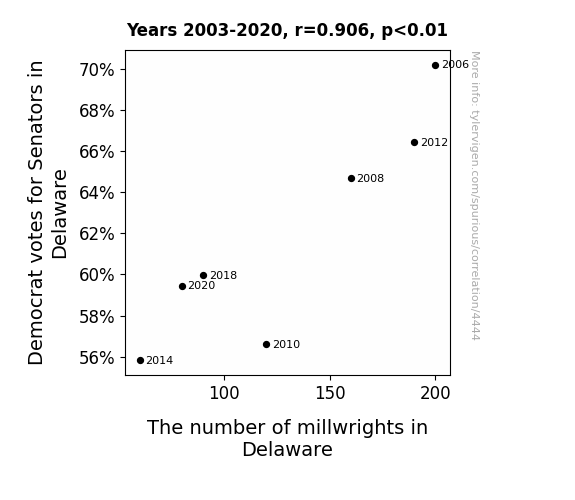Our investigation into the connection between Democrat votes for Senators in Delaware and the number of millwrights in the state unveiled a remarkably robust correlation over the years 2003 to 2020. The correlation coefficient of 0.9059146 suggests a strong positive relationship between these two variables, with an r-squared value of 0.8206813 indicating that approximately 82% of the variation in the number of millwrights can be explained by the variation in Democrat votes for Senators. In a fit of statistical significance, the p-value clocked in at less than 0.01, cementing the strength of this association.