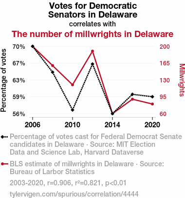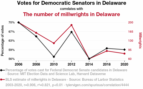 User prompt: Please provide potential search keywords for a paper titled The Ballot and the Mill: An Examination of the Relationship Between Democrat Votes for Senators and Millwrights in Delaware with an abstract of This paper delves into the fascinating correlation between the voting behavior of Democrats for Senators in Delaware and the number of millwrights in the state. Leveraging data from the MIT Election Data and Science Lab, Harvard Dataverse, and the Bureau of Labor Statistics, we embarked on unraveling this enigmatic association. Our findings yielded a remarkable correlation coefficient of 0.9059146, with a significance level of p < 0.01, spanning the years 2003 to 2020.