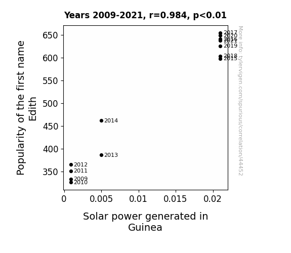 This means 96.8% of the change in the one variable (i.e., Solar power generated in Guinea) is predictable based on the change in the other (i.e., Popularity of the first name Edith) over the 13 years from 2009 through 2021.