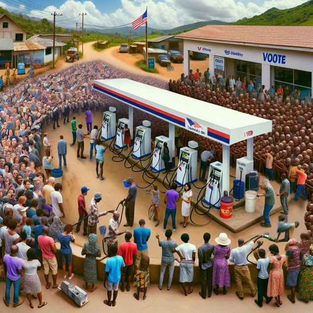 ChatGPT: Generate an image of a surreal setting featuring a bustling polling station in Montana with long queues of voters proudly displaying "I Voted" stickers. Blend this scene with a lively gas station in Togo crowded with people waiting to pump gasoline into their vehicles. The juxtaposition of the political fervor and economic activity should convey a sense of energy and hope, symbolizing the unexpected connection between political support and economic activity.