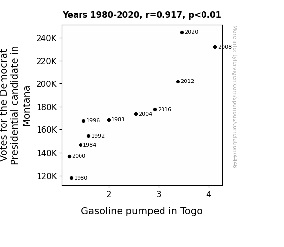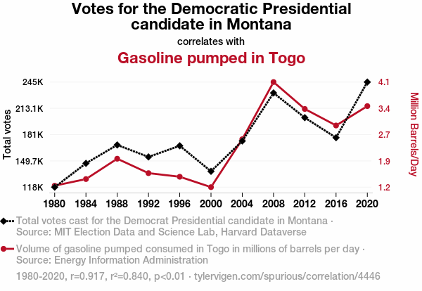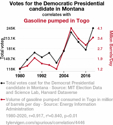 Montana, Democrat, votes, gasoline, Togo, correlation, statistical analysis, MIT Election Data and Science Lab, Harvard Dataverse, Energy Information Administration, correlation coefficient, p-value, whimsical, serendipitous synchrony, mirthful mismatch absurd, incongruous phenomena