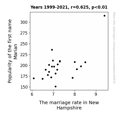 This means 39% of the change in the one variable (i.e., The marriage rate in New Hampshire) is predictable based on the change in the other (i.e., Popularity of the first name Marian) over the 23 years from 1999 through 2021.
