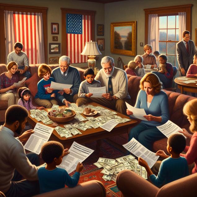 User prompt: Please respond with an image generation prompt that would be likely to create an interesting visual using DALLE-3, using the following style: [ Cutsy art illustration ] and depicting this scene: In Ohio, more and more households were seen carefully examining their car insurance bills. As the numbers crept higher, the support for the Democrat Presidential candidate also seemed to be on the rise. The scene showed families comparing insurance plans while engaging in discussions about the upcoming election, with a shared eagerness to find financial relief and political change. Keep the visual depiction simple. Do not include any words or speech bubbles.