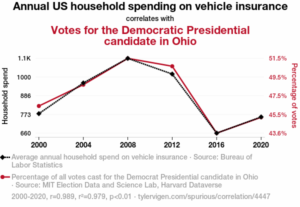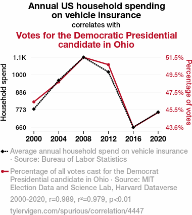 - The spurious research paper: The Tantalizing Tango of Transportation Trends: Examining the Relationship Between Annual US Household Spending on Vehicle Insurance and Votes for the Democrat Presidential Candidate in Ohio