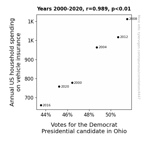 Our findings revealed a correlation coefficient of 0.9893045 and a statistically significant p-value less than 0.01 for the period spanning from 2000 to 2020. This suggests that there may indeed be a strong relationship between annual US household spending on vehicle insurance and votes for the Democrat presidential candidate in the heartland state of Ohio.