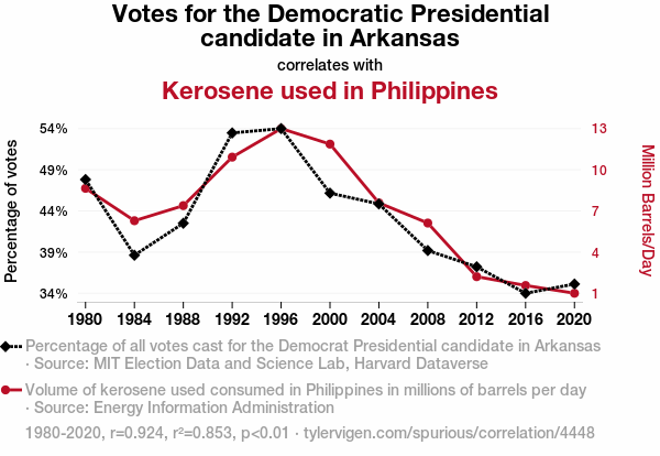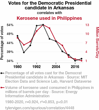 User prompt: Please provide potential search keywords for a paper titled Burning Questions: An Examination of the Surprising Correlation Between Democrat Votes in Arkansas and Kerosene Consumption in the Philippines with an abstract of This paper presents an unexpected and eyebrow-raising study on the relationship between the number of votes for the Democratic presidential candidate in Arkansas and the consumption of kerosene in the Philippines. Data from the MIT Election Data and Science Lab, Harvard Dataverse, and the Energy Information Administration were utilized to explore this unorthodox connection. Surprisingly, our research team found a remarkably high correlation coefficient of 0.9235069 and statistical significance with p < 0.01 for the years 1980 to 2020. While the findings may seem as improbable as a penguin in the Sahara, this study underscores the importance of carefully examining unexpected correlations and the need for further investigation into the global impact of seemingly unrelated events.