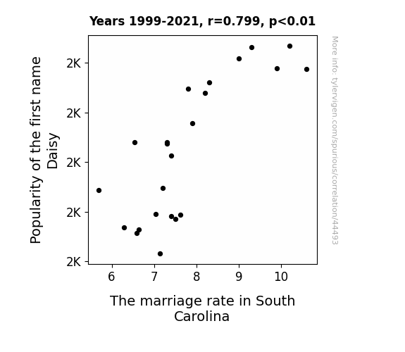 This means 63.9% of the change in the one variable (i.e., The marriage rate in South Carolina) is predictable based on the change in the other (i.e., Popularity of the first name Daisy) over the 23 years from 1999 through 2021.