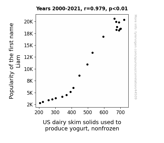 This means 95.8% of the change in the one variable (i.e., US dairy skim solids used to produce yogurt, nonfrozen) is predictable based on the change in the other (i.e., Popularity of the first name Liam) over the 22 years from 2000 through 2021.