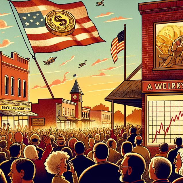 Prompt: Generate an image of a bustling town square in Arkansas with a large crowd gathered to vote in the presidential election. In the background, a banner reading "Vote Libertarian" flutters in the breeze, drawing attention to the candidate's platform supporting a gold-backed currency. Adjacent to the square, a jewelry store prominently displays the price of gold on a digital board, with the value steadily rising as the demand for gold surges due to the growing support for the idea of a gold-backed currency. The scene captures the intersection of political endorsement and economic impact as the value of gold soars in response to the increasing support for the Libertarian candidate and advocacy for a gold standard. The image should convey the energy of the crowd and the significant economic fluctuation without the use of any words or speech bubbles. The depiction should include only scenes, people, and objects, it should not include text or speech bubbles.