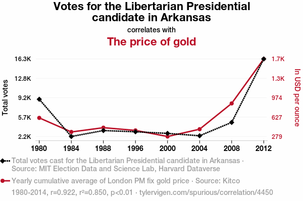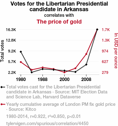 - The spurious research paper: Going for the Gold: The Glittering Relationship between Votes for the Libertarian Presidential Candidate in Arkansas and the Price of Gold