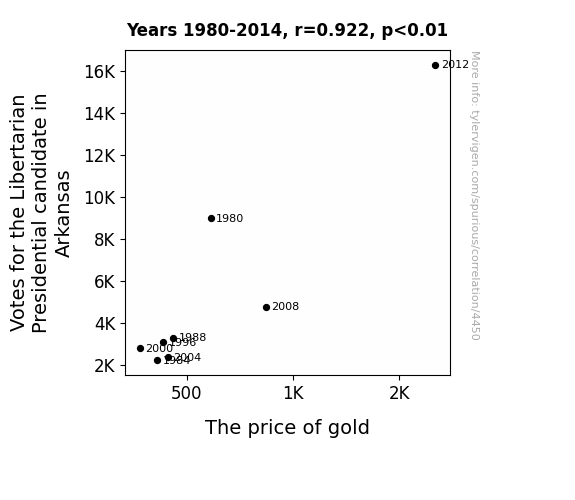 Venturing into the world of statistical analyses and electoral oddities, our study sets out to unravel the captivating relationship between votes for the Libertarian presidential candidate in Arkansas and the price of gold. In doing so, we have contributed to the evolving landscape of political economy, unearthing a correlation that stretches the boundaries of traditional research paradigms. By illuminating the intricate connections that underpin the diverse tapestry of human behaviors and market phenomena, we have showcased the unexpected and the extraordinary in the seemingly mundane. The glint of gold, it appears, is not devoid of the glint of political fervor.