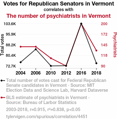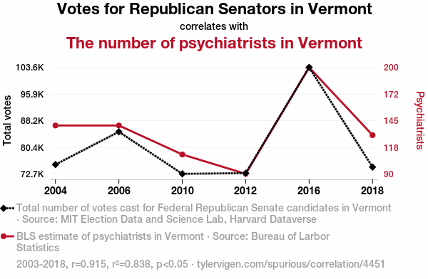 - The spurious research paper: The Elephant in the Therapy Room: An Analysis of the Correlation between Republican Votes for Senators and the Number of Psychiatrists in Vermont