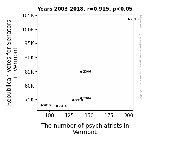 User prompt: Please provide potential search keywords for a paper titled The Elephant in the Therapy Room: An Analysis of the Correlation between Republican Votes for Senators and the Number of Psychiatrists in Vermont with an abstract of This paper delves into the curious relationship between political leanings and psychological well-being in the picturesque state of Vermont. Through meticulous data analysis spanning from 2003 to 2018, we've unveiled a surprising connection between the number of psychiatrists practicing in Vermont and the inclination of voters to support Republican senators. With a correlation coefficient of 0.9154638 and a p-value of less than 0.05, the evidence suggests that there might be more than just maple syrup brewing in the Green Mountain State.