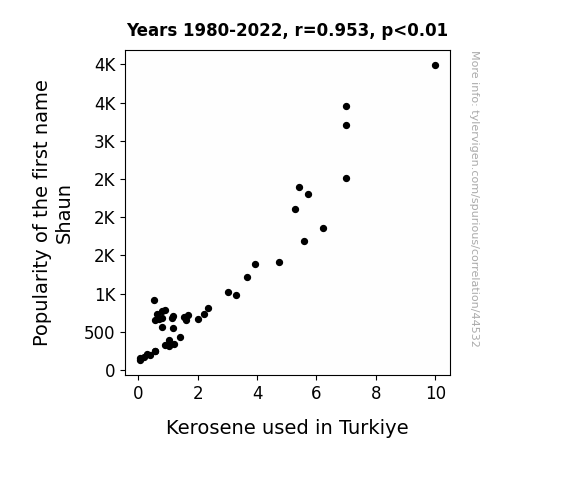 This means 90.8% of the change in the one variable (i.e., Kerosene used in Turkiye) is predictable based on the change in the other (i.e., Popularity of the first name Shaun) over the 43 years from 1980 through 2022.
