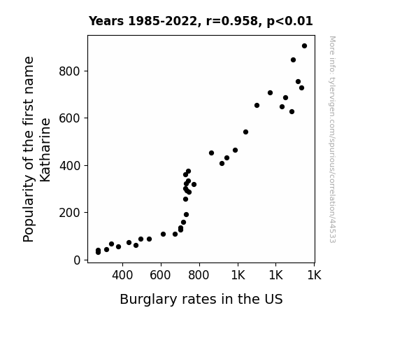 This means 91.8% of the change in the one variable (i.e., Burglary rates in the US) is predictable based on the change in the other (i.e., Popularity of the first name Katharine) over the 38 years from 1985 through 2022.