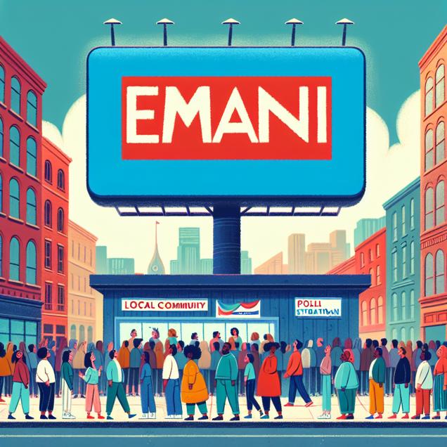ChatGPT: [Whimsical illustration] Show a lively Washington street scene with a vibrant crowd gathered around a colossal billboard bearing the name "Emani" in bold, eye-catching letters. Beyond the billboard, illustrate a line of cheerful citizens waiting outside a polling station, eagerly casting their votes for the Democratic presidential candidate. The scene should exude an energetic atmosphere, capturing the buzz and excitement around the name "Emani" and the fervent support for the Democratic candidate.