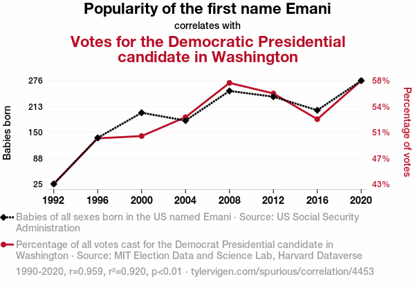 This means 92% of the change in the one variable (i.e., Votes for the Democrat Presidential candidate in Washington) is predictable based on the change in the other (i.e., Popularity of the first name Emani) over the 8 years from 1990 through 2020.