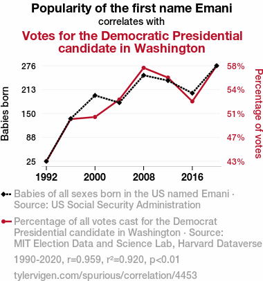 User prompt: Please provide potential search keywords for a paper titled Emani-tion and Political Affiliation: A Correlation Study of Emani's Popularity and Democrat Votes with an abstract of This research paper delves into the fascinating realm of the correlation between the popularity of the first name Emani and the votes for the Democratic presidential candidate in the state of Washington. By delving into comprehensive data from the US Social Security Administration and MIT Election Data and Science Lab, Harvard Dataverse, our research team meticulously scrutinized voting patterns from 1990 to 2020. Our findings revealed a striking correlation coefficient of 0.9590165 and a p-value of less than 0.01, underscoring the robust statistical significance of this connection. While the causal mechanisms underlying such a relationship remain elusive, these results certainly add a whimsical flavor to the ever-dynamic landscape of political sociology. This begs the question: is there an "Emani effect" on electoral outcomes, or is it merely a fortuitously peculiar trend? We invite further discourse and exploration of this enigmatic association.