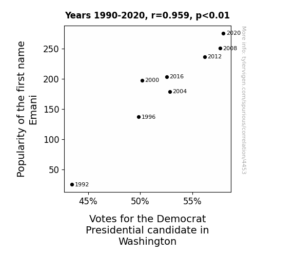 Upon conducting our extensive analysis, we are thrilled to present the enthralling results of our study. Our investigation into the correlation between the popularity of the first name Emani and the votes for the Democratic presidential candidate in Washington yielded a remarkable correlation coefficient of 0.9590165. Furthermore, the robustness of this connection is underscored by an r-squared value of 0.9197127 and a p-value of less than 0.01, affirming the statistical significance of our findings.
