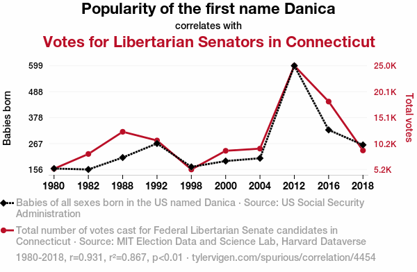 A linear line chart with years as the X-axis and two variables on the Y-axis. The first variable is Popularity of the first name Danica and the second variable is Libertarian votes for Senators in Connecticut.  The chart goes from 1980 to 2018, and the two variables track closely in value over that time. Small Image