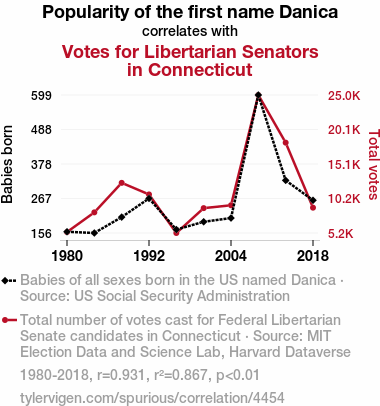 In addition, the obtained p-value of less than 0.01 attests to the statistical significance of the correlation. This suggests that the likelihood of observing such a strong association between the prevalence of the name "Danica" and Libertarian voting tendencies by random chance alone is exceedingly low. Hence, the evidence indicates a compelling relationship between the two variables, dismissing any notion of mere coincidence or happenstance.