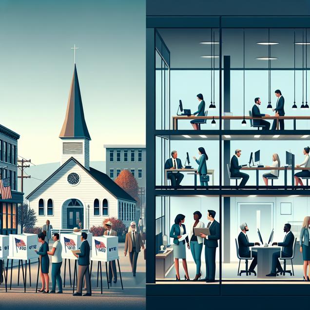 User prompt: Please respond with an image generation prompt that would be likely to create an interesting visual using DALLE-3, using the following style: [ Minimalism ] and depicting this scene: In a bustling Idaho town, the local voting booths brim with activity as citizens cast their ballots for Republican Senators. Meanwhile, in a nearby office building, a group of marketing managers strategize and brainstorm, their creative energy palpable. As the number of votes for Republican Senators increases, the vibrant marketing team expands, each new member eager to channel the electrifying political campaigns into impactful consumer engagement. A shared sense of determination radiates through the air, as both the political and marketing worlds thrive in harmony, united by the shared goal of winning hearts and minds. Keep the visual depiction simple. Do not include any words or speech bubbles.